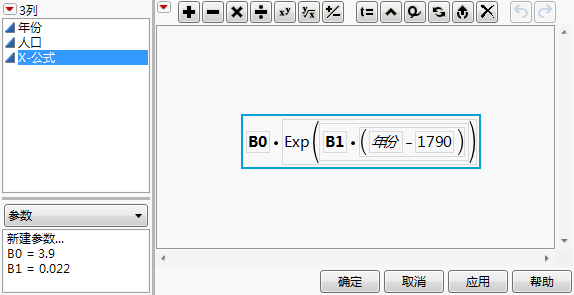 该公式显示在公式编辑器面板中。参数 B0 和 B1 的值显示在左侧的“参数”面板中。使用函数元素标绘该公式。