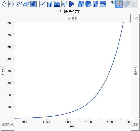 在该示例中您有 1790 年到 2000 年美国人口的数据。您拟合一个非线性模型,将美国人口作为年份的函数,您想标绘这个非线性公式。