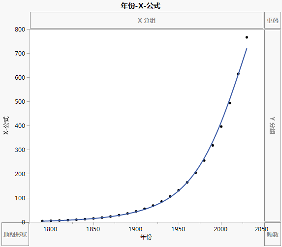 点的标绘一直到 2030 年。这些点对应函数 X-公式(在年份列中的年份处求值)的值。可以在人口缺失的年份(2010、2020 和 2030)对该函数求值。显示的平滑线只是该函数的近似。您要查看该函数本身。