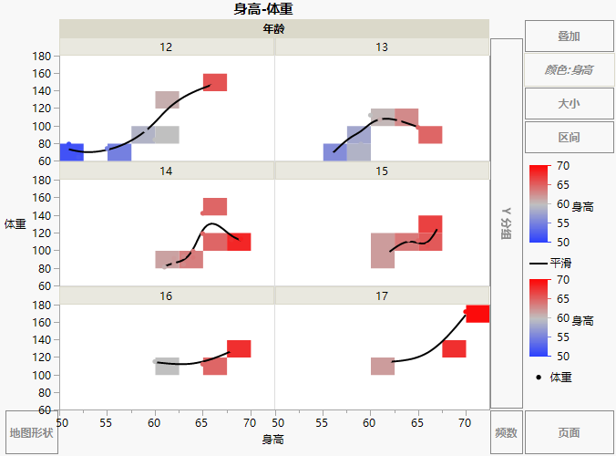 面板颜色基于每个年龄组中学生的平均身高。正如预期的那样,17 岁的学生最高。该面板中的图显示其体重如何随身高变化。