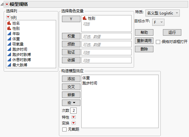 显示“模型规格”窗口,其中包含两个变量作为模型效应。请注意“特质”为“名义型 Logistic”。若响应是有序型,“特质”将为“有序型 Logistic”。