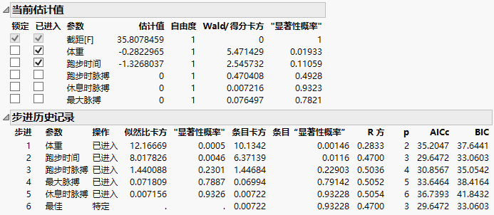 两个变量体重和跑步时间基于“停止规则”进入模型。
