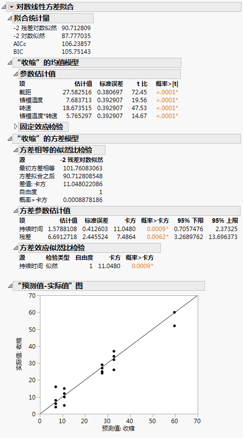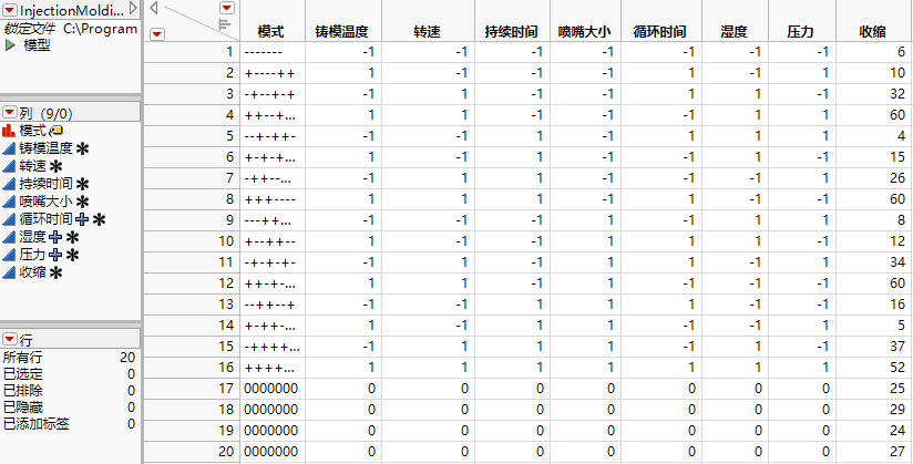 数据表 InjectionMolding.jmp 包含来自 7 因子 27-3 部分析因设计的实验结果,该设计添加了四个中心点 (Montgomery 1991)。初步调查已确定响应均值似乎只随前两个因子铸模温度和转速变化,方差则受持续时间影响。