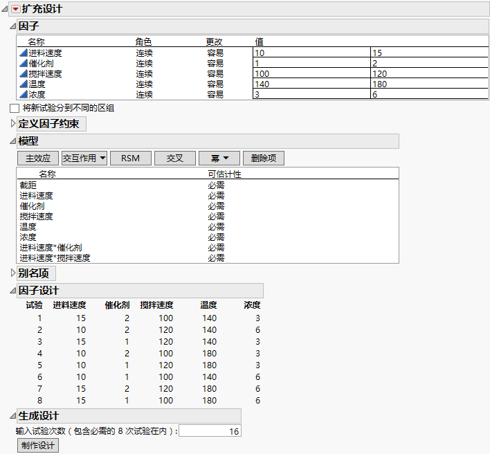 注意:您可以选择将新试验分到不同的区组以将分区组因子添加到任何设计。但是,请记住本示例是在 16 次试验中估计所有双因子交互作用,当在模型中有其他分区组因子时这不可能做到。