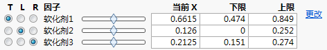 当前因子设置。在框中点击可更改因子的值。按比例调整其他因子的值以保持混料之和不变。也可以使用滑块控件更改因子设置的值。