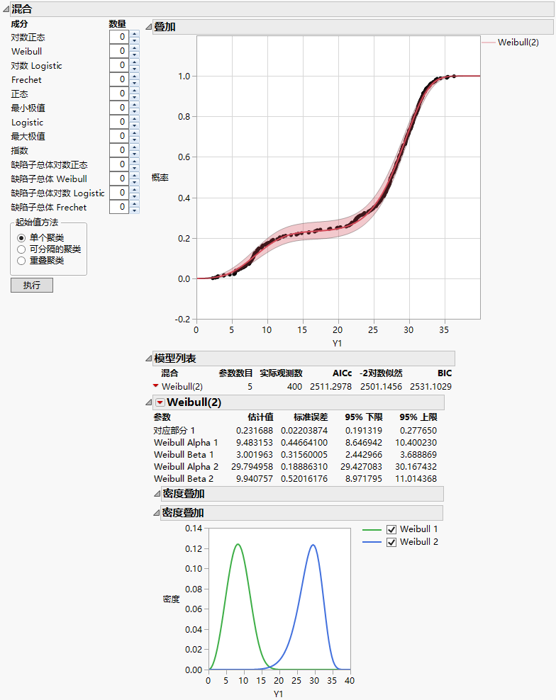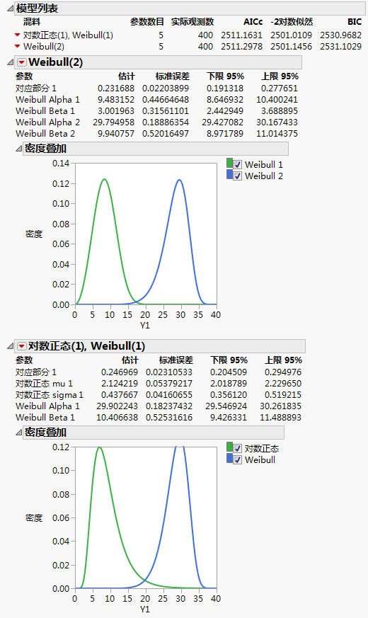 “叠加”图随之更新以显示两个混合模型。“模型列表”中的图和统计量指出“对数正态(1),Weibull(1)”混合模型看起来提供了与“Weibull(2)”混合模型极为相似的拟合。