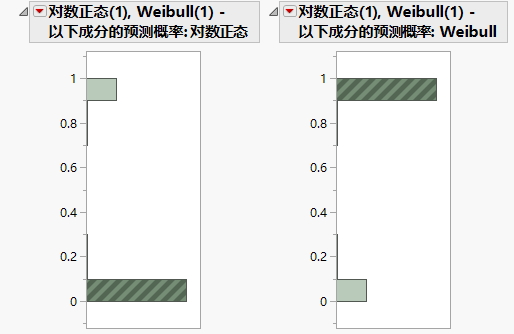 6. 在对数正态(1),Weibull(1) - 以下成分的预测概率: Weibull 的直方图中,点击与接近 1 的值对应的直条。