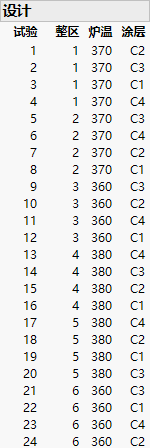 箱体腐蚀裂区实验的“设计”分级显示项 显示了针对 Box Corrosion Split-Plot.jmp 实验的定制设计(共计 24 次试验)的“设计”分级显示项。由于炉温的更改指定为困难,所以构建了整区因子,以表示炉温的随机区组设置。