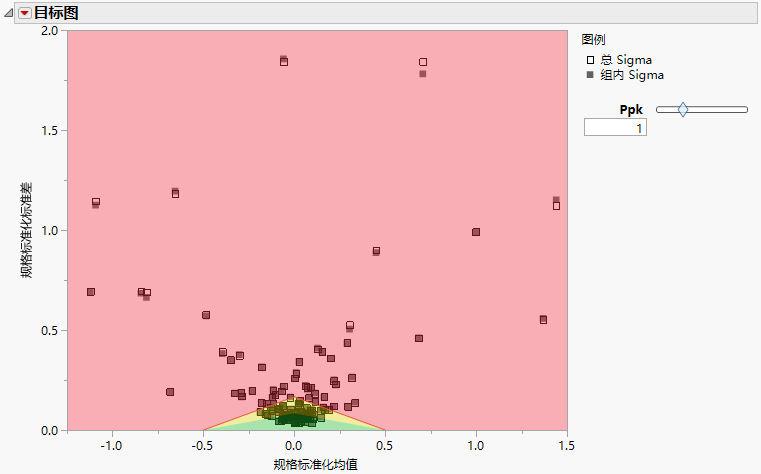 默认情况下,Ppk 滑块和其下的值设置为 Ppk = 1。这近似不合格率为 0.0027(若为正态分布)。目标三角形表示框中显示的 Ppk。要更改 Ppk 值,请移动滑块或在框中输入数字。
