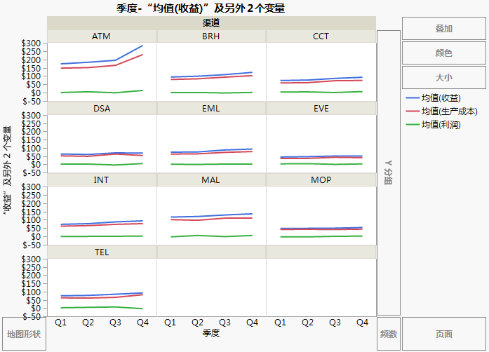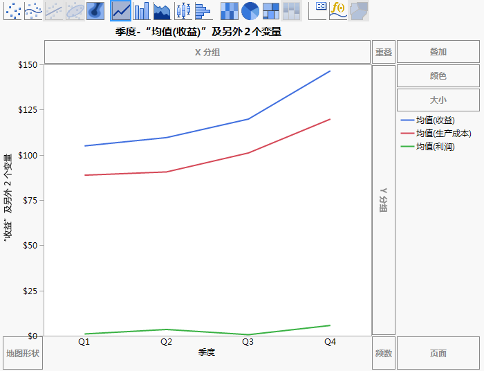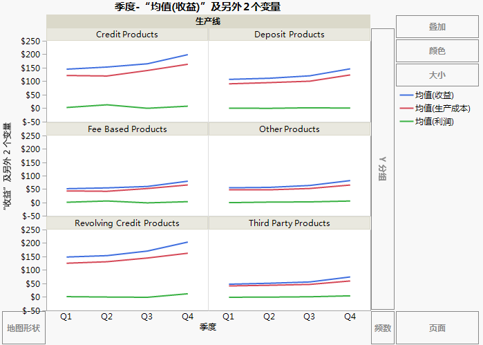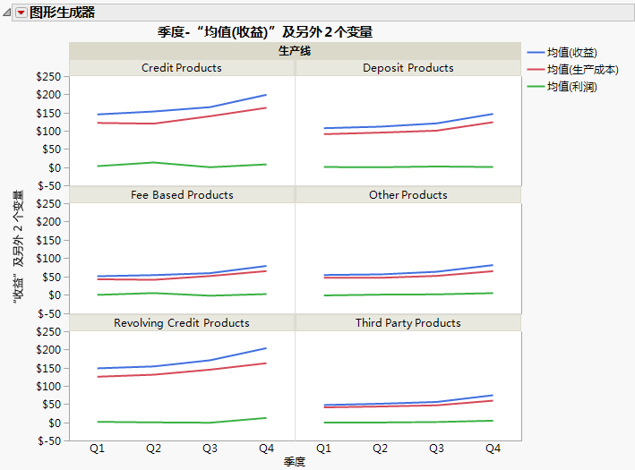 最终的线图 显示每个产品线的收入、成本和利润。业务分析人员想要查看不同产品线之间的收益差别。最终的线图 中的线图可以得出下列结论:
