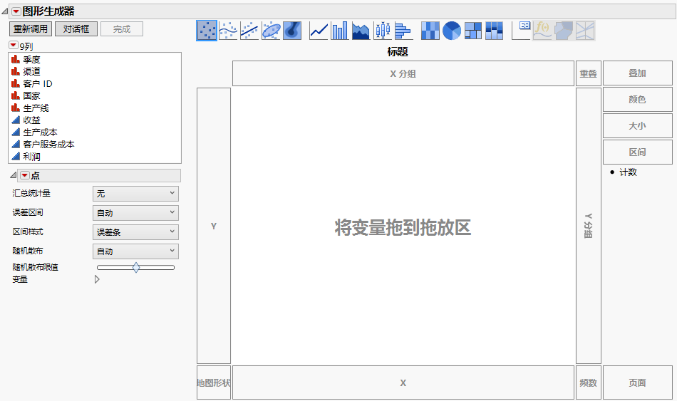 使用“图形生成器”可以通过交互方式创建和修改图形。JMP 中的大多数图形通过启动平台并指定变量的方式创建。若您想创建不同类型的图形,可以从“图形”菜单启动特定平台。但是,使用“图形生成器”您可以随时更改变量和图形类型。