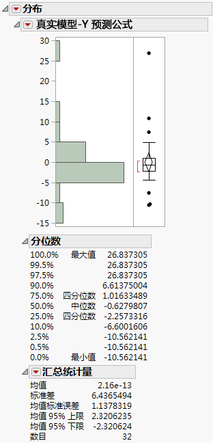 您可以使用刻画器探索整个域上预测偏倚的范围。要找到最小和最大偏倚点,请从“预测刻画器”红色小三角菜单中选择最优化和意愿 > 意愿函数。请参见《刻画器指南》中的意愿刻画和优化。要评估设计点上的预测偏倚,请选择分析 > 分布来查看分布分析。