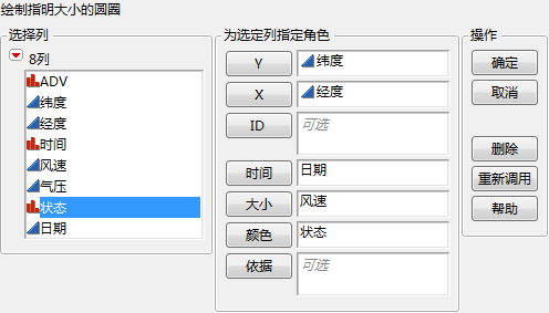 下一个示例使用 Katrina Data.jmp 样本数据表,其中包含有关卡特里娜飓风的数据,比如纬度、经度、日期、风速、气压和状态。添加背景地图可以帮助您查看飓风发生的路线以及基于它的规模和强度对陆地产生的影响。针对该示例开发了脚本,它是数据表的一部分。