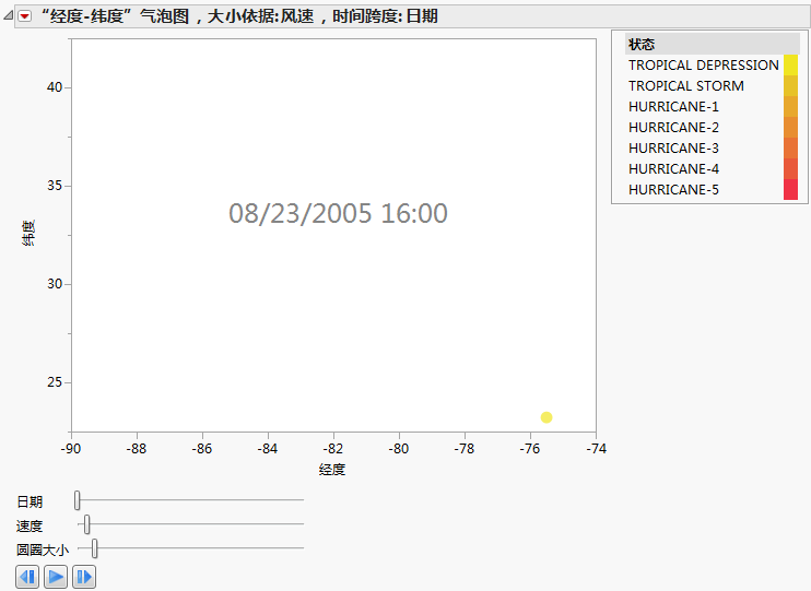 3. 将“日期”滑块拖至右侧,如Hurricanes.jmp 的气泡图 中所示。