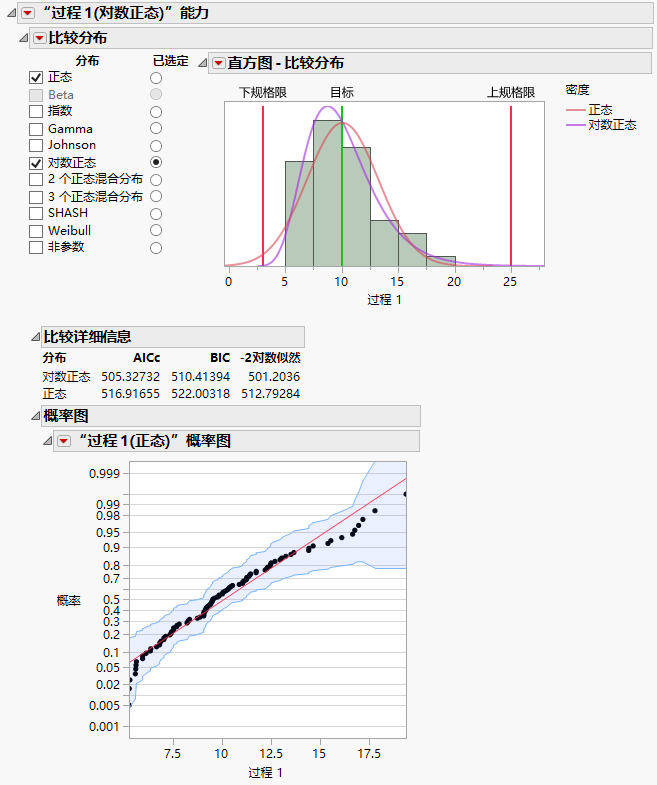 比较带有正态概率图的分布 显示 Process Measurements.jmp 样本数据表中过程 1 的“比较分布”报表。“已选定”分布(即“对数正态”)正与“正态”分布作比较。“比较详细信息”报表显示这两种分布的拟合统计量。