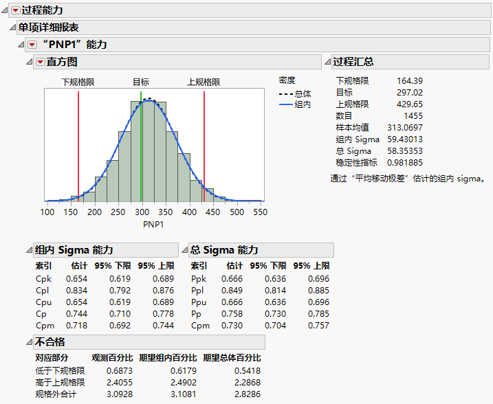 单项详细报表 显示了 Semiconductor Capability.jmp 样本数据表中的 PNP1 的“单项详细报表”,如示例:包含正态变量的“过程能力”平台中所述。