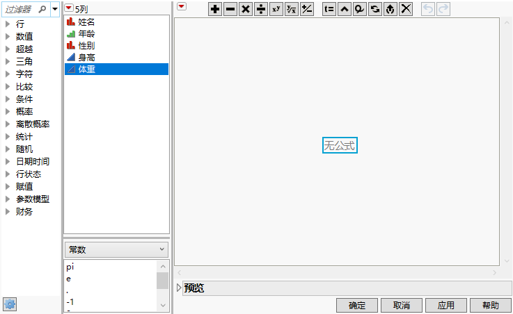 公式既可以通过简单地指定数值型、字符型或行状态常数来构成,也可以包含基于条件子句的复杂计算。常数包括常用的数值项,如 e、pi、-1、0、1 和 2。有两种方法可以将常数值添加至公式: