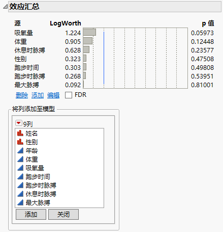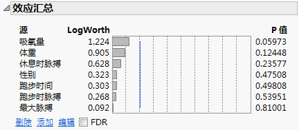 “效应汇总”报表 显示了 Fitness.jmp 数据表的“效应汇总”报表的初始视图。标记为 FDR 的复选框控制显示在汇总表中的列。