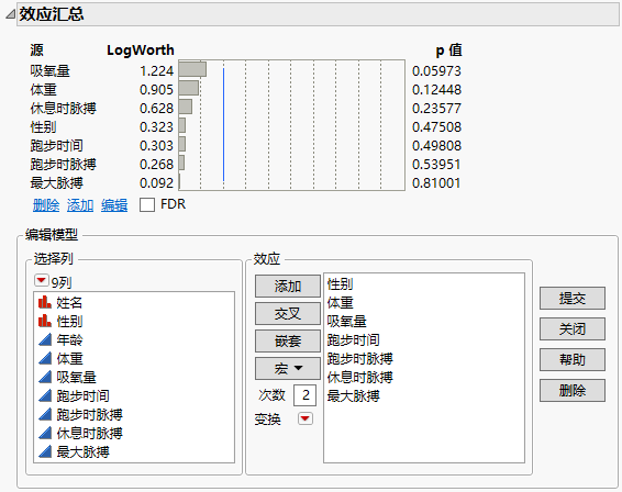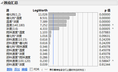显示每个模型效应的 LogWorth,该值定义为 -log10(p 值)。该变换调整 p 值的大小以便于绘图。超过 2 的值在 0.01 水平下显著(因为 −log10(0.01) = 2)。