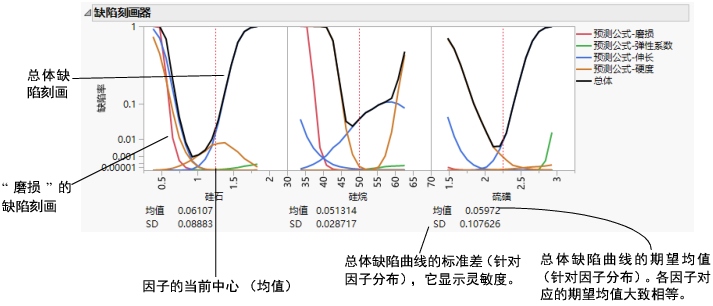 “缺陷刻画器”显示缺陷率作为固定在指定均值处的每个因子的函数,而所有其他因子则根据它们的随机规格进行变化。若有多个带有规格限的输出,则每个输出都有不同的带颜色编码的缺陷率曲线。黑色曲线显示总缺陷率。