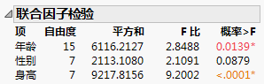请注意,年龄检验的自由度为 15。该检验涉及年龄的五个参数、年龄*性别的五个参数,以及身高*年龄的五个参数。该检验的原假设是全部 15 个参数都为 0。