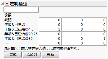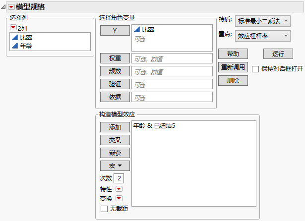使用纽结样条效应选项可通过平滑多项式的一段来拟合一个指定的效应。选择该特性后将显示一个窗口,该窗口支持您指定结点数。(仅针对主效应连续项应用纽结样条。)