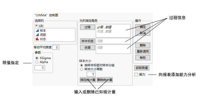 (仅可用于 UWMA 图。)指定 UWMA 图中移动平均跨度的值。请参见UWMA 图的控制限。