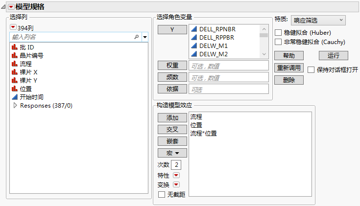选择分析 > 拟合模型。输入您的 Y 变量和模型效应。从“特质”列表中选择响应筛选。