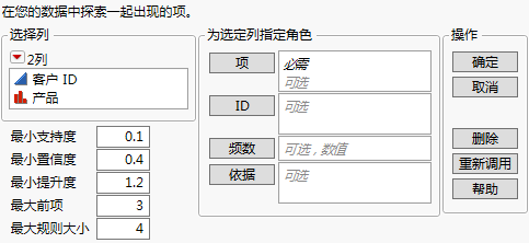 • 可以在“项目”角色中指定多个项响应列。在这种格式中,ID 和“频数”角色是可选的。若指定 ID 角色,则具有相同 ID 的所有行都组合为一个交易。若指定“频数”角色,则将频数应用到交易而不是交易中的特定项。