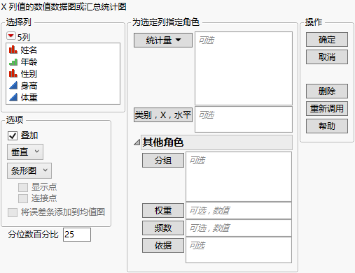 在为至少一个 Y 变量选定了分位数统计量时设置特定分位数。默认值为 25。请指定不同的分位数: