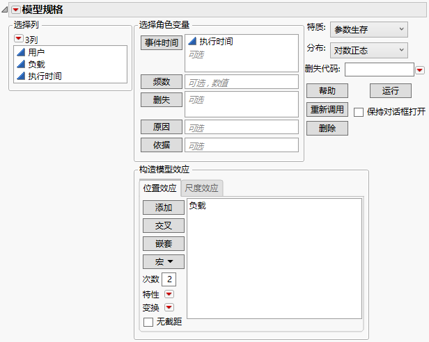 使用这些选项指定位置和尺度效应。有关“构造模型效应”选项的详细信息,请参见《拟合线性模型》中的构造模型效应。