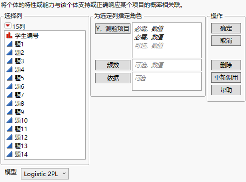 若为模型选择 Logistic 3PL,则系统会提示您在点击“确定”后为猜测参数输入一个罚值。对于 3PL 模型,罚值的默认值为 0。不过,您可以为 c 参数(凭猜测答对某题的概率)输入非零罚值。该罚值类似于您在岭回归中使用的罚值参数的类型。该罚值与估计猜测参数的方差有关。使用罚值有以下优点: