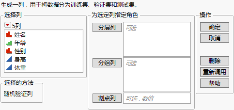 描述基于指定的分层、分组和割点列的选定验证列方法。选择某种方法并点击“确定”后,可以在“生成验证列”报表中为每个集指定分配。请参见指定比率或相对比率和设置割点。有五种方法可用于构造保留集: