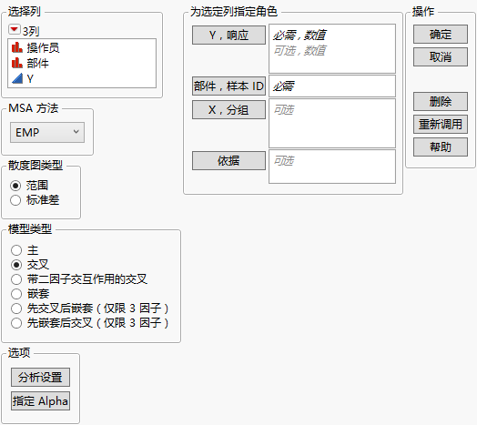 选择要使用的方法:EMP(评估测量过程)或量具 R&R。本章介绍 EMP 方法。有关量具 R&R 方法的详细信息,请参见变异性量具图。