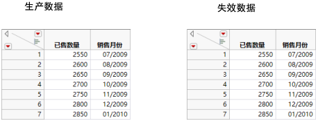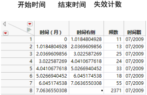 包含失效数据(例如失效单元数、生产日期和失效日期)的表。