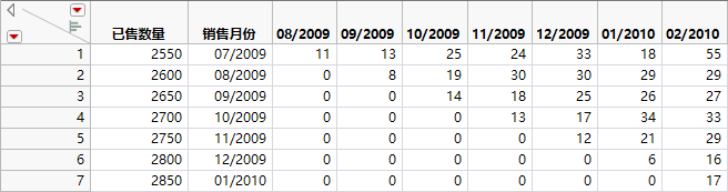 合同数据通常以 Nevada 格式储存:装运或生产日期以及指定期间内的失效计数的形状类似内华达州。Nevada 格式的示例 显示了 Small Production.jmp 样本数据表。