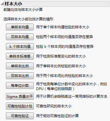 “样本大小与功效”平台是用于规划实验或研究的计算器的集合。可通过选择实验设计 > 设计诊断 > 样本大小与功效来启动“样本大小与功效”平台。