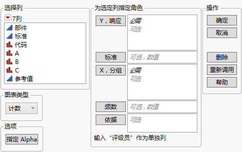 通过选择分析 > 质量和过程 > 变异性/计数量具图启动“变异性/计数量具图”平台。将图表类型设置为计数。