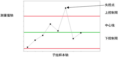 • 图上标绘的每个点都代表单个过程测量值或汇总统计量。在控制图示例 中,各点表示测量值样本的平均值。