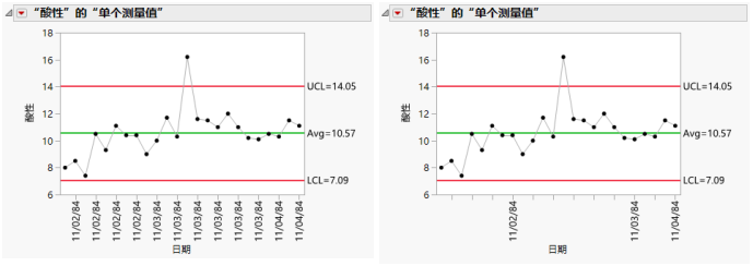 例如,Pickles.jmp 数据表列出了三天每天进行抽样的测量值。在示例:添加了标签的 X 轴刻度标 中,默认情况下,水平轴上每隔一个刻度就显示一个标签。有时这会让标签重复出现,如示例:添加了标签的 X 轴刻度标 中的左图所示。若指定标签使用 8 作为增量,水平轴会每天标注一次,如右图所示。