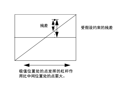 一般杠杆图的演示 显示如何在杠杆图中描述残差。从某个点到拟合线的距离是包含该效应的模型的残差。从该点到水平线的距离是模型中不含该效应时的剩余误差。换言之,杠杆图中的均值线表示参数(效应)的假设值被限制为 0 时的模型。