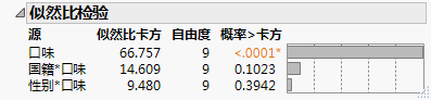 似然比检验 显示通过运行 Potato Chip Responses.jmp 中的脚本“口味”的 MaxDiff 获得的“似然比检验”报表。