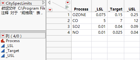 • 高型表包含四或五列,每个过程对应一行。第一列的数据类型为字符型,其中包含在“过程能力”平台中分析的列的名称。接下来三列需分别命名为下规格限、目标和上规格限。这些列名之前还可以附加下划线字符。名为显示限值的最后一列(可选)指定规格限在某些分析图中是否显示为参考线。