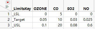 • 宽型表对于“过程能力”平台中分析的每列都包含三行和一列,另有一个 _LimitsKey 列。在 _LimitsKey 列中,有三行需要包含标识符 _LSL、_Target 和 _USL。