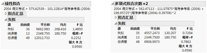 线性拟合和多项式拟合的“方差分析”报表的示例