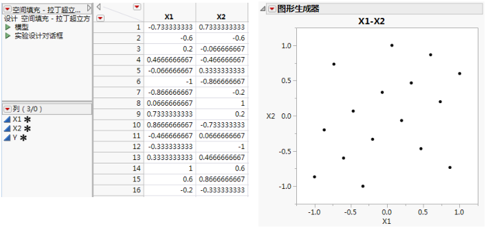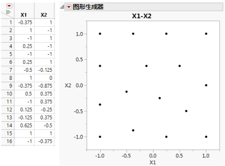 但是,正如双因子的拉丁超立方设计 中的示例所示,拉丁超立方设计可能不能为您提供最优空间填充属性。该示例是双因子 16 次试验的拉丁超立方设计,它将因子水平设置在 -1 到 1 之间。双因子图显示该设计具有缺失覆盖的区域。特别是对接近 0 的 X1 和接近 -1 的 X2 覆盖很差。