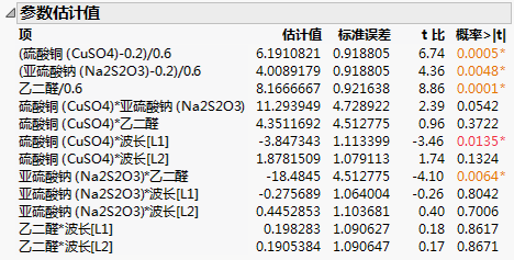 假定您关注波长 L2 处的预测值。还假定亚硫酸钠 (Na2S2O3) 和乙二醛分别设置为其低值 0.2 和 0,硫酸铜 (CuSO4) 设置为其高值 0.8。在这种情况下,预测的阻尼等于硫酸铜 (CuSO4) 的参数估计值 (6.191) 加上硫酸铜 (CuSO4)*波长[L2] 的参数估计值 (1.878)。您可以在“预测刻画器”中对此进行验证。