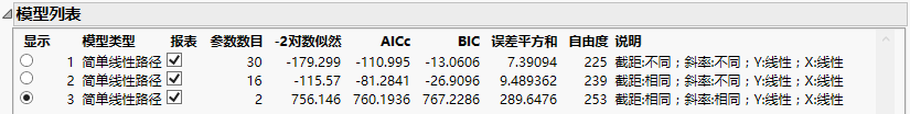 “模型列表”报表提供每个拟合模型的汇总统计量和其他选项。模型列表 显示了包含三个模型的汇总的“模型列表”的示例。