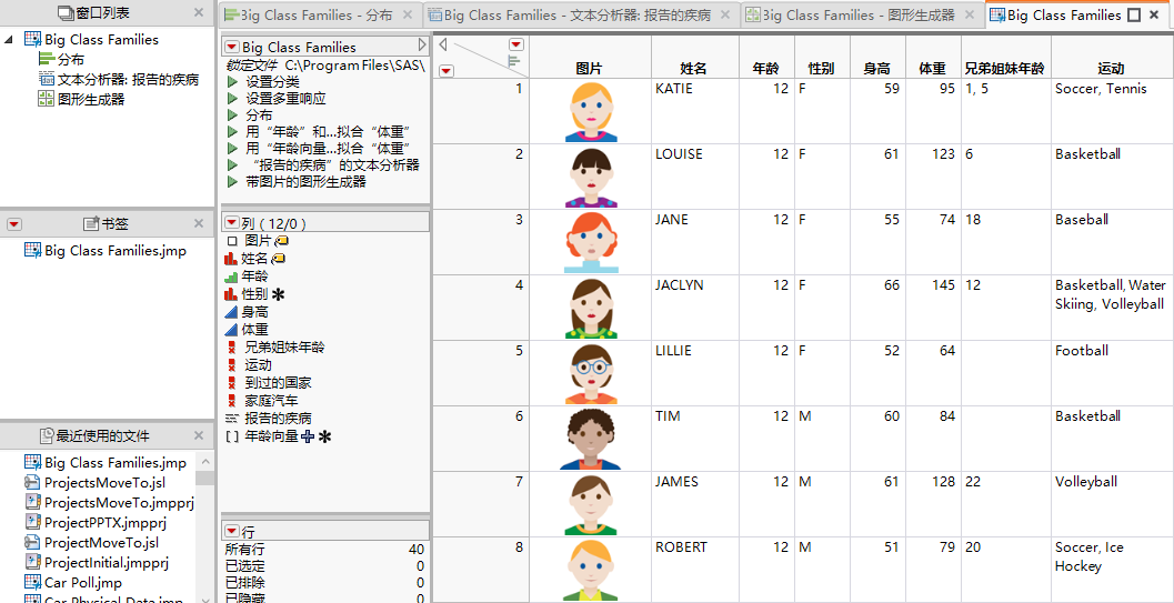 1. 选择帮助 > 样本数据库,然后打开 Big Class Families.jmp。