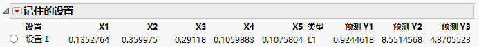 本例使用 Five Factor Mixture.jmp 样本数据表。有五个成分(x1 到 x5)、一个分类过程因子(类型)和三个响应(Y1、Y2 和 Y3)。为每个响应拟合了响应曲面模型,并且预测方程保存在预测 Y1、预测 Y2 和预测 Y3 中。
